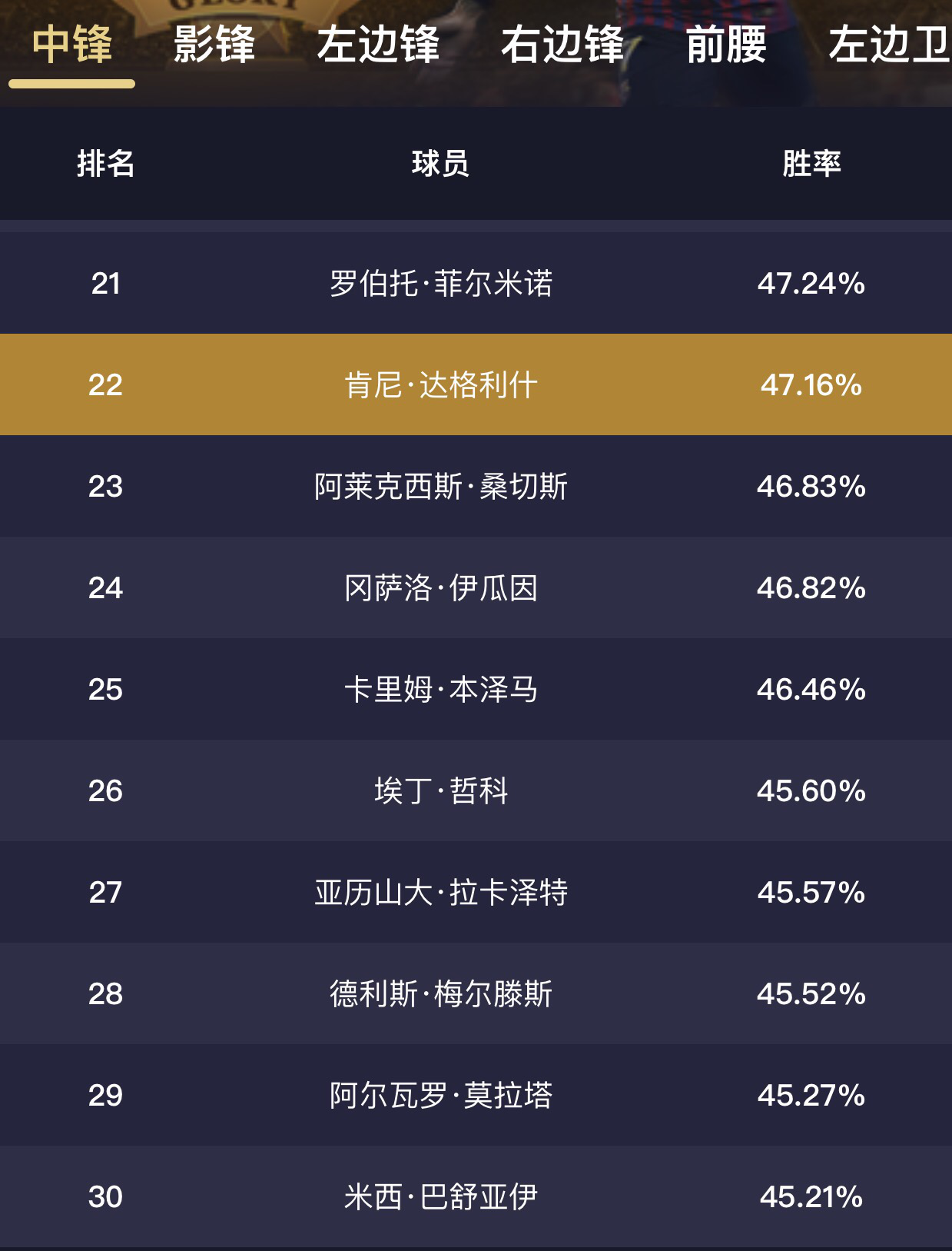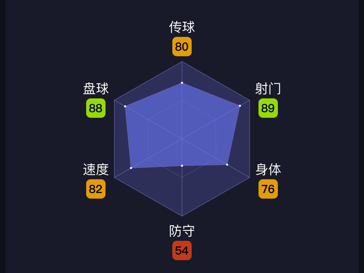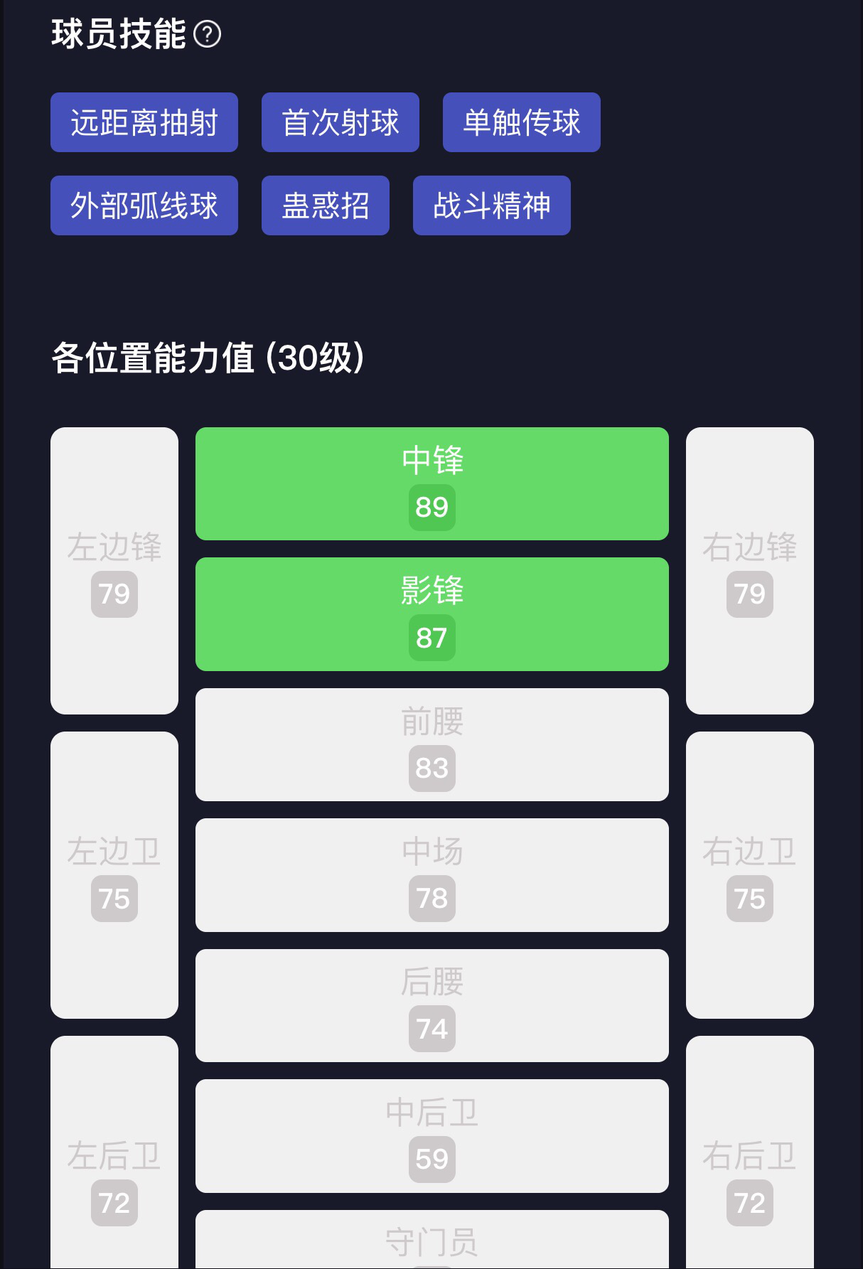 基础数据(30级评分:89)但看达格利什在《实况足球》里面的评分的话还算得上不错。《实况足球》里面统计的达格利什是30岁的时候,所以说基本也没咋有升值空间了,玩家们想要高突的话还是要想清楚利弊。