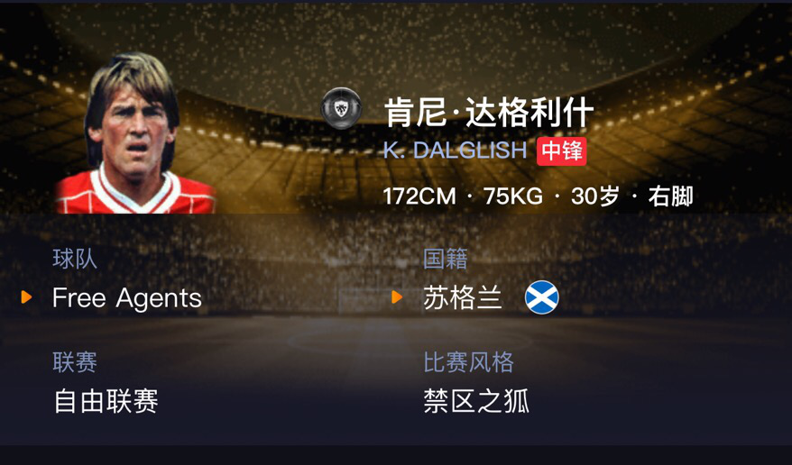 《实况足球》有很多传奇球员不是很好用这个说法其实并不是空穴来风,确实有很多的球员在小编看来真的不太能称得上“传奇卡”这几个字。而且很多传奇卡虽然数值都很可怕,但实际上本身模型太差,不太能够在场上有很好的作用。今天小编就来给大家排一排坑,首先给大家介绍这一位很多人都不喜欢用的传奇中锋——肯尼·达格利什。这位苏格兰球星也是在《实况足球》里面胜率极低!