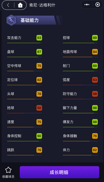 具体数值方面,在《实况足球》里面,达格利什的进攻能力值相当劲爆。攻击能力有93,控球和盘球分别是89和87的数值。而射门方面也是有89的数值。而达格利什的爆发力和脚下力量都有88的水平。另外他还有90的身体控制,总体来说还是不错的。