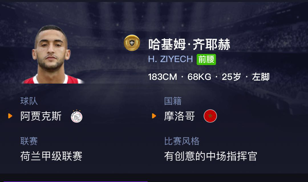 《实况足球》手游里面虽然经常会有一些活动,让很多玩家可以拥有很多的金卡,但事实上在天梯比赛里面,真正决定你胜负的是那几张关键的黑卡。但是很多玩家并不像花钱去玩一个游戏,这就造成了你的阵容可能比对面弱,但事实上很多金卡也不是说不能使用。今天小编就来给大家介绍一个《实况足球》手游里面超实用的金卡球员,他就是来自阿贾克斯的球星——齐耶赫。