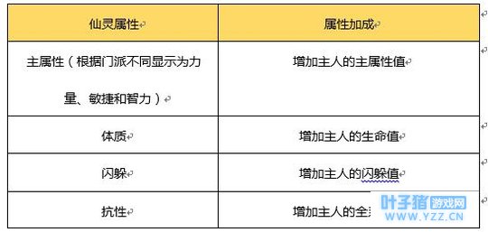 【仙灵属性解析】 在仙灵对玩家在战斗上的帮助中,最直观的体现就是仙灵属性对玩家属性的加成。仙灵在成长过程中将逐步获得属性点(每次升级获得5点),根据属性点分配的不同,仙灵也会对主人的属性提供各种各样的加成。