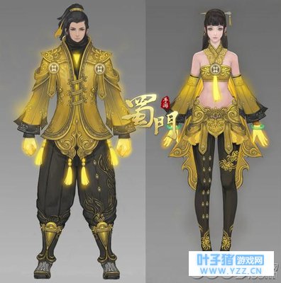 [身披黄金甲,绘幅江山画!“金鎏织裳”时装来袭!] 头配凤翅紫金冠,身披梭子黄金甲。这款名为“金鎏织裳”的时装,金色与黑色交织显得威严端庄又高贵优雅。男装的颜色区分非常鲜明,在黑色的中和之下,金色显得不再过分的张扬,释放威武之气的同时,还散发着沉稳的魅力,周身没有丝毫多余的装饰,男性的刚猛之气跃然眼前。女装则完美凸显了女性角色的身材,设计师巧妙运用了不同色彩对于线条的影响,将黑色置于腿部,而上衣的金色与皮肤白皙的色调完美贴合,使得整体外观显得修长了许多,背后的两条飘带也使得角色俏皮了许多。