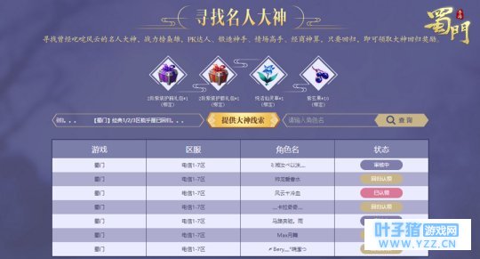战力枭雄?PK达人?锻造神手?情场高手?只要你曾是蜀门的名人大神,《蜀门手游》向你诚挚发起邀请!只要回归即可领取大神回归奖励,珍稀紫装礼包无条件奉送!海量好礼等待认领,曾经的大神你在哪里?