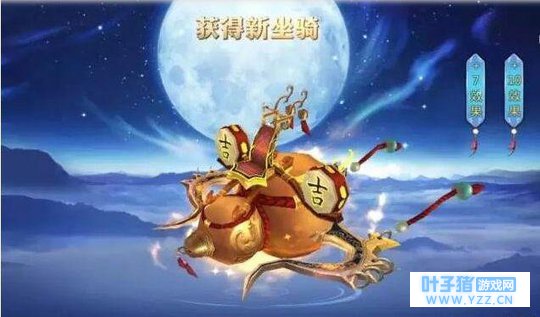 【品质】:S级 【初始骑术值】:200 【基础速度】:60 相传为当年八仙渡海时铁拐李所乘的便是 “凝阳玉葫芦”,在天上水下皆可使用,乃不可多得的仙家之物。坐骑外形如其名,全身是一个葫芦的造型,且可以御风飞行,葫芦上方设置坐骑供乘坐使用,坐骑旁两面分别有两面吉鼓,寓意吉祥如意,而S级坐骑的定位让 “凝阳玉葫芦”的速度远超其他品质的坐骑,锻造+10后的玉葫芦将会变得更加酷炫! 新服在活动期间,玩家可在“福利”中每天可以低价购买3种玉葫芦折扣礼包,不仅有多种锻造宝石相送,还有机会开出全新S级炫酷坐骑——凝阳玉葫芦!