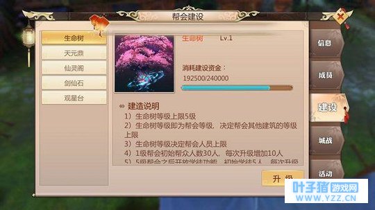生命树——帮会升级关键点 顾名思义,生命树是决定帮会成长最重要的地方。生命树的等级就代表了帮会的等级,每次升级生命树需要消耗一定的帮会建设资金,需要在当前帮会建设资金捐赠满了以后,方可升级,当生命树升至满级后,帮会才会开放学徒功能。