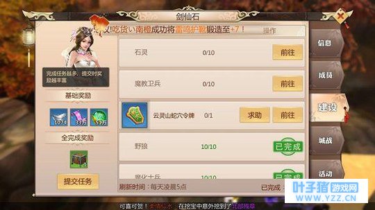剑仙石——丰厚的经验报酬 剑仙石是接受并完成帮会悬赏任务的地方。每天会放出10个悬赏任务,大部分任务都比较容易完成,例如击杀野狼10匹、击杀石灵10个等,只需要点击“前往”即可进入相应地图自动击杀目标。对于一些特殊要求的任务如“云灵山蛇穴令牌”类上交道具的任务,由于这些道具是概率获得的,玩家们囊肿羞涩时也可以通过”求助“向帮会内小伙伴进行求助哦。