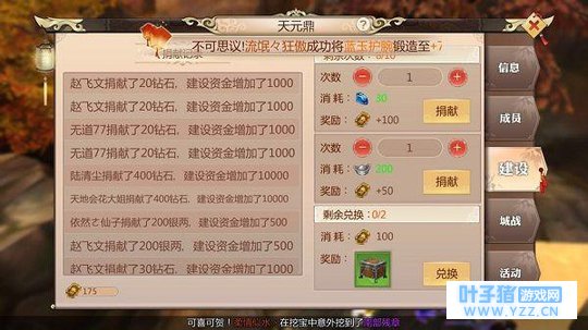 天元鼎——贡献资金好礼拿 天元鼎是为帮会贡献成长资金的地方,可以捐献20钻石或200银两给公会,每日可在天元鼎中捐献10次,当然这也不是无偿捐献,当捐献钻石和银两时,分别可以获得50和100的帮贡奖励。每日也可以在天元鼎中消耗200帮贡奖励来兑换两个天元鼎宝箱,宝箱可以开出宝石包和经验丹。