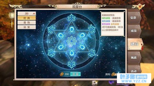 观星台——装备法宝抽抽抽 夜观星象方可知其变数,观星台就是这么一个神奇的地方。在观星台中每次花费一定数量的帮贡即可进行观星,随着观星台不断地升级,需要花费的帮贡和可获得的装备的品阶也会增多和升级哦~若是能知天机者,还有机会获得金色装备呢!