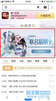 交行联名信用卡游戏礼包领取流程 1、申办交通银行蜀门手游联名信用卡 想要获得游戏礼包的前提条件就是要先申办一张交行的联名信用卡,当然也只能是《蜀门手游》的联名信用卡! 进入专属办卡链接后,根据提示填写相应内容即可申请成功,审核通过后,交行将会安排制作你的信用卡并寄出,这个时间不会太长~请玩家们耐心等待~ ①官网进入