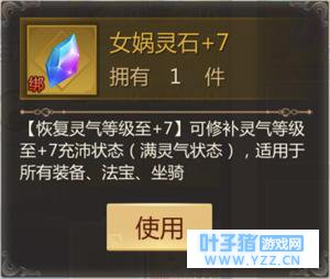 集满180个女娲灵石+7碎片即可合成1个女娲灵石+7,可用于恢复所有装备、法宝、坐骑的灵气等级至+7充沛状态。