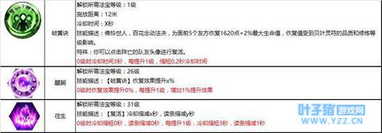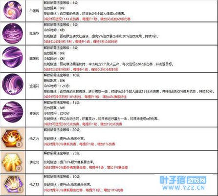 灵珠加点:处于提高治疗量的考虑,建议大家优先点满“红莲华”来减少其冷却时间,进而使我们可以更频繁的获得治疗量提升的加成,之后我们可以点满“暗莲灼”,通过更频繁的击退敌人来提高自己的生存能力,之后大家可以酌情点满“佛之力”、“佛之劫”和“佛之怒”来提高自己的输出能力。