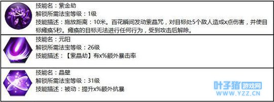 紫金梭加点:推荐大家先点满“晶壁”来提高抗暴能力,进而提高生存站场能力,随后点“元阳”和“紫金劫”来进一步提高输出能力。