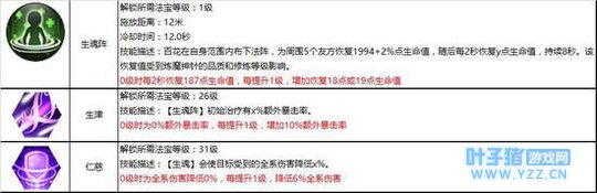 炼魔神针加点:初期我们可以点满“生津”来提高治疗暴击率,这样一来在治疗暴击的时候,我们的回复量就会获得极大的提升,而求稳的玩家也可以优先点满“生魂阵”来稳步提升自己的治疗量,出于自身生存能力的考虑,我们随后需要点满“仁慈”来降低全系伤害,降低被秒杀的风险。