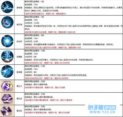 月轮加点:建议大家先点满“激电缠”来将减速效果最大化,随后点满“雷之力”和“雷之劫”来将伤害最大化,而之后的技能点玩家可以按照个人喜好分配到自己喜换的技能上。