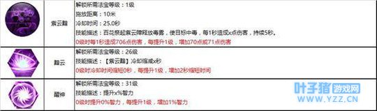 紫云瘴加点:处于对基础属性加成的考虑,推荐大家先点满“醒神”来获得5%的智力加成,随后点满“黯云”来获得10秒的冷却缩减,这样一来,对方就会时刻处于我方紫云黯的笼罩之下,最后点满“紫云黯”来提高技能伤害。