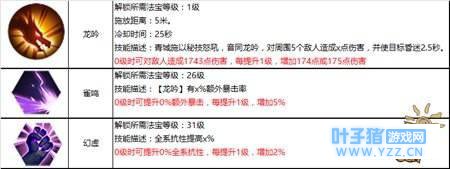 龙雀环虽然主打控制能力,但它的辅助输出能力也不可小视,如果选用龙雀环的话,我们最好先点满雀鸣和幻虚,这样一来,发动龙吟之后的输出能力和生存能力瞬间就会提升,让对手猝不及防。 |