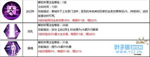 出于提高生存能力的考量,优先加满迷乱,这样一来既可以提高躲闪率又能增加最大生命值,可谓一石二鸟,之后再点满迷幻阵,进一步提高减伤,增加开启后的生存能力。 离垢钟: