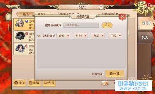 同样的,蜀友们可以根据他人的名片内容来查找好友,只要选定不同的信息,系统就会自动向玩家推荐符合要求的好友,这样一来,无论是同城蜀友,还是同龄知己,全都触手可及!