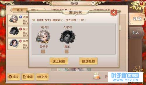 【庆生之日,遥寄贺情!】 为了贴近各位蜀友与朋友的距离,《蜀门手游》全新好友系统还添加了生日祝贺功能,每当有朋友即将过生日的时候,好友系统中就会出现蛋糕图标提示,这样大家就不会错过挚友们的生日了。同时大家还可以在好友系统中以自己的方式为好友送上一份生日祝福,无论是祝福邮件还是赠送礼物,都任君选择,让大家全方位的传达祝福!