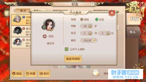 【专属名片,详实可查!】 在《蜀门手游》全新的好友系统中,每位玩家可以设定只属于自己的名片,名片信息从性别到居住省份应有尽有。这样一来,大家与好友之间的距离就更近了一步。同时,玩家也可以选择不公开个人资料,给自己的隐私加上一把锁!