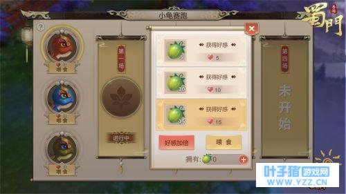 在每一场篝火晚会活动中,玩家可在仅有的15分钟活动时间内进行4轮小龟赛跑的好运大战。每一轮比拼只有3只乌龟可供玩家选择,玩家选择一只乌龟点击后,可根据自己的灵果数量对乌龟进行喂食。灵果喂食的越多,则一场比赛结束后玩家可获得的篝火币越多。以最高一档15个灵果为例,玩家若选对了乌龟赢得了一场赛跑胜利,则可以获得30个篝火币,若没选对则可以获得3个篝火币。当然了,玩家还可以选择好感加倍使用钻石进行额外喂食,可得奖励越多!