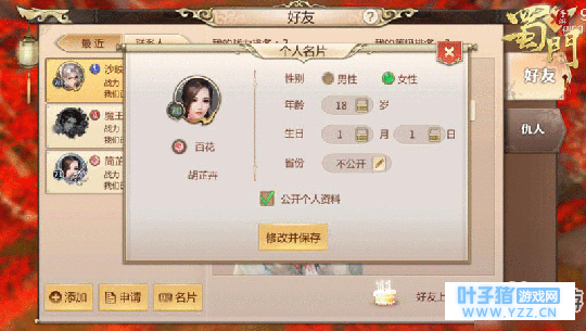 【专属名片,详实可查!】 在《蜀门手游》全新的好友系统中,每位玩家可以设定只属于自己的名片,名片信息从性别到居住省份应有尽有。这样一来,大家与好友之间的距离就更近了一步。同时,玩家也可以选择不公开个人资料,给自己的隐私加上一把锁!