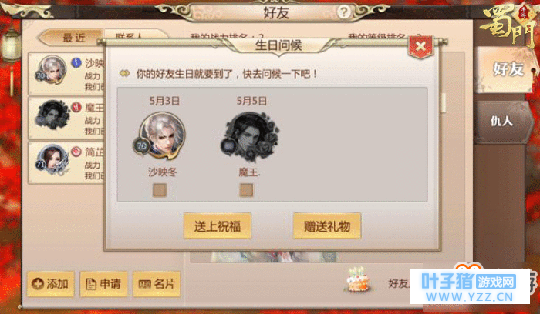 【庆生之日,遥寄贺情!】 为了贴近各位蜀友与朋友的距离,《蜀门手游》全新好友系统还添加了生日祝贺功能,每当有朋友即将过生日的时候,好友系统中就会出现蛋糕图标提示,这样大家就不会错过挚友们的生日了。同时大家还可以在好友系统中以自己的方式为好友送上一份生日祝福,无论是祝福邮件还是赠送礼物,都任君选择,让大家全方位的传达祝福!