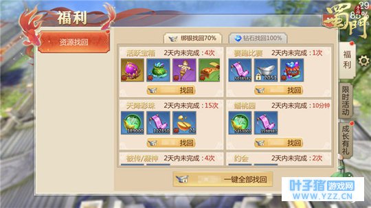【上线一键找回,福利资源无忧!】 全新的资源找回系统位置非常醒目,当《蜀门手游》的玩家登陆游戏,点击右下角跳动的礼袋即可进入。玩家通过资源找回系统,只要消耗一定的货币,就可以找回两日内没有完成的部分天书活动所错过的资源,值得注意的是,约会和传功等活动也在其中。如果蜀友觉得一个个活动点击领取有点麻烦,还可以通过一键找回按钮,一次性回收所有错过的资源,可以说是既方便又贴心。