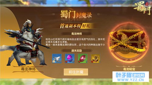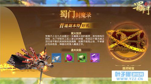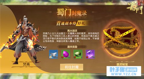 【妖魔乱世 首通得礼】 《蜀门手游》封魔录系统是对玩家首次通关游戏副本进行奖励的系统,既是鼓励玩家挑战更难的副本,又是为玩家提供强化自身实力的道具。当玩家达到31级之时,游戏主界面将新增封魔录系统,封魔录系统的初始副本即31级的离天峰副本,点击进入以后,可以看到关底BOSS焚离的详细介绍与通关奖励。玩家只要首次通关离天峰副本即可获得相应的通关奖励。