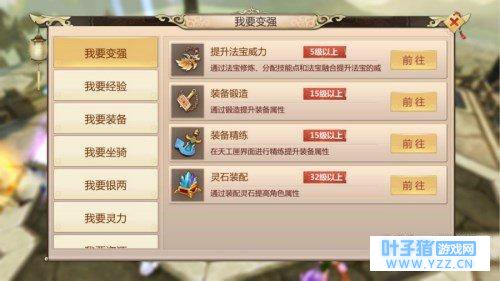 使战力提升的方法当然不仅有以上几种,仙灵等级的提升、法宝技能增强也能够提升战力。除了装备、坐骑等直接相关的要素,银两等素材的获取也是变强的必要条件,而对于所有与变强相关的要素,在《蜀门手游》中的变强功能中都有分类细致的引导,只要从中选择自己迫切需要的类目,并跟随引导进行活动,一定能得到令人满意的答案。