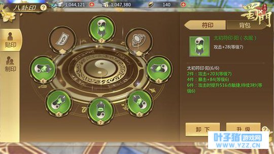 【八卦升级属性增强】 符印制作完成后,会自动进入符印背包。在“贴印”界面可以看到所有的已经制作好的符印。