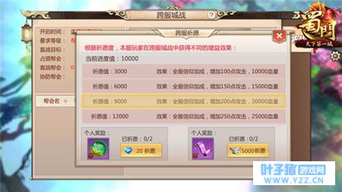 当全服务器的祈愿值到达一定的数值,所有参与跨服城战的玩家都可以获得可观的BUFF加成!所有玩家可以选择通过钻石或者绑银进行祈愿,每次祈愿可以为全服贡献20分的祈愿进度值,每一种祈愿最多可以进行2次。在玩家祈愿的同时,为了感谢玩家对整个服务器的付出,祈愿玩家还能获得大量经验和灵力作为贡献的嘉奖。