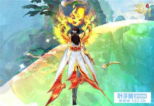 背面的披风呈割裂状,延续了白红的配色与金色的勾边。金轮在身后悬浮,缓缓地散发明黄的光芒,正中间火焰样式的图纹燃着熊熊火光,宛如耀眼的太阳,吸睛夺目!