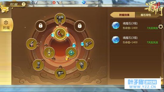 那么制作的魔石如何使用呢,接下来就为大家揭秘附魔系统,魔石可以附在角色的主副法宝与防具上,不过区别是主副法宝可附两颗魔石,魂魄魔石皆可,而防具只能附一颗魔石,且只能使用魄魔石。附魔是有7天时间限制的,尽管这样,在为法宝防具附魔后依然可以提升角色战力,所以玩家记得及时补充附魔。此外,玩家制作出的魂、魄魔石均可放在交易行直接售卖,这样不主修生活技能的玩家也可以通过购买直接享用属性加成,而修炼了生活技能玩家也获得了新的赚钱方式。