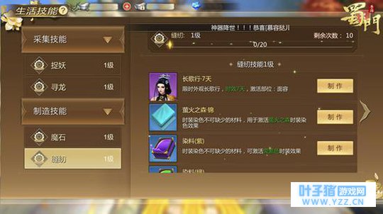不同的缝纫等级能解锁制作的面容与染色道具也不尽相同,“缝纫”技能可制造的有:角色限定面容,时装染布锦缎与不同颜色的时装染料。随着技能等级的提升也会解锁更多不同面容与不同颜色的染料,但每天制作染料与面容的次数也是有限的,希望大家持之以恒。