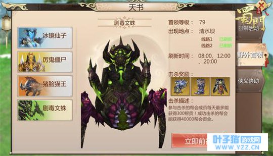 【开放野外地图“清水坝”,迎战世界BOSS“剧毒文蛛”!】 随着《蜀门手游》开放78级等级上限,全新野外地图“清水坝”迎来了千万蜀友的冒险探访。看似平静祥和的清水坝,背后却是危机四伏。清水坝的水仍然清澈,但附近的岳府却是一片破败惨淡,原来竟是惨遭魔宗毒手,岳府上下只剩一个孩子与一个老伯侥幸活了下来,如今站在岳府的遗址之上竟然发现还有魔宗余孽还在徘徊。