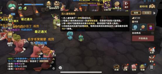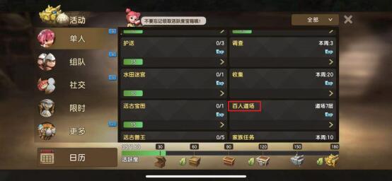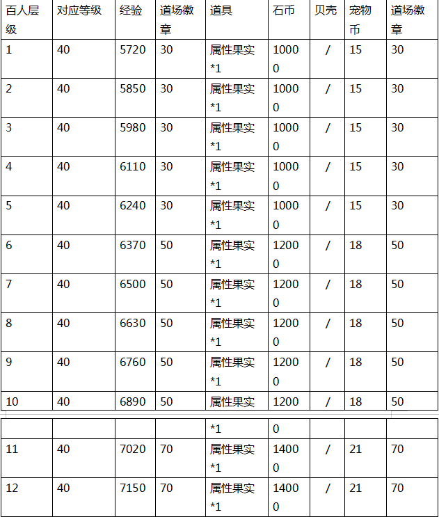 《石器时代M》百人道场,轻松爬塔彰显实力! 驯兽师们经历了一段时间的锻炼,实力不断提升,如何能够验证你的实力呢?推荐Lv.40以上的驯兽师们前往《时期时代M》手游活动>>单人>>百人道场,向着100层发起你的挑战! 目前百人道场分为[单人模式]和[组队模式],如果在单人模式下,点击进入百人道场为驯兽师当前所处的层数;如在组队模式下,则以队长所在层数为准。组队模式下需要所有成员均满足参加条件,待所有成员点击确认后即传送至队长所在的层数。 百人道场是《石器时代M》手游中的一个一次性爬塔玩法,共计100层,每一次都会有一个守护者,击败守护者方可前往下一层。当前爬塔进度将会同步保存。 点击进入[百人道场],寻找NPC-道场管理员,进入百人道场。 (完成100层通关奖励-邦奇诺) 百人道场规则 1、 百人道场属于一次性挑战玩法 2、 每通过5层的挑战会进图到道场秘宝层,在里面可以拾取大量奖励。 3、 每10层时可邀请其他玩家协助挑战,其余层数只能单人挑战。 4、 协助挑战的玩家可以获得徽章,每周协助其他玩家挑战百人道场最多获得700个徽章。 徽章:通过挑战百人道场或者帮助其他玩家完成特定任务和活动获得,可以用于购买徽章商店中的道具。 百人道场每层提示信息 每一层的重要提示都在这里了,如果你能按照提示进行挑战,那么100层一定难不倒你呢! 每次完成一层的挑战都会有奖励给予到各位驯兽师,那么你一定十分好奇,通关100层可以给你带来怎么样丰富的奖励!我们接着往下看吧! 层级奖励