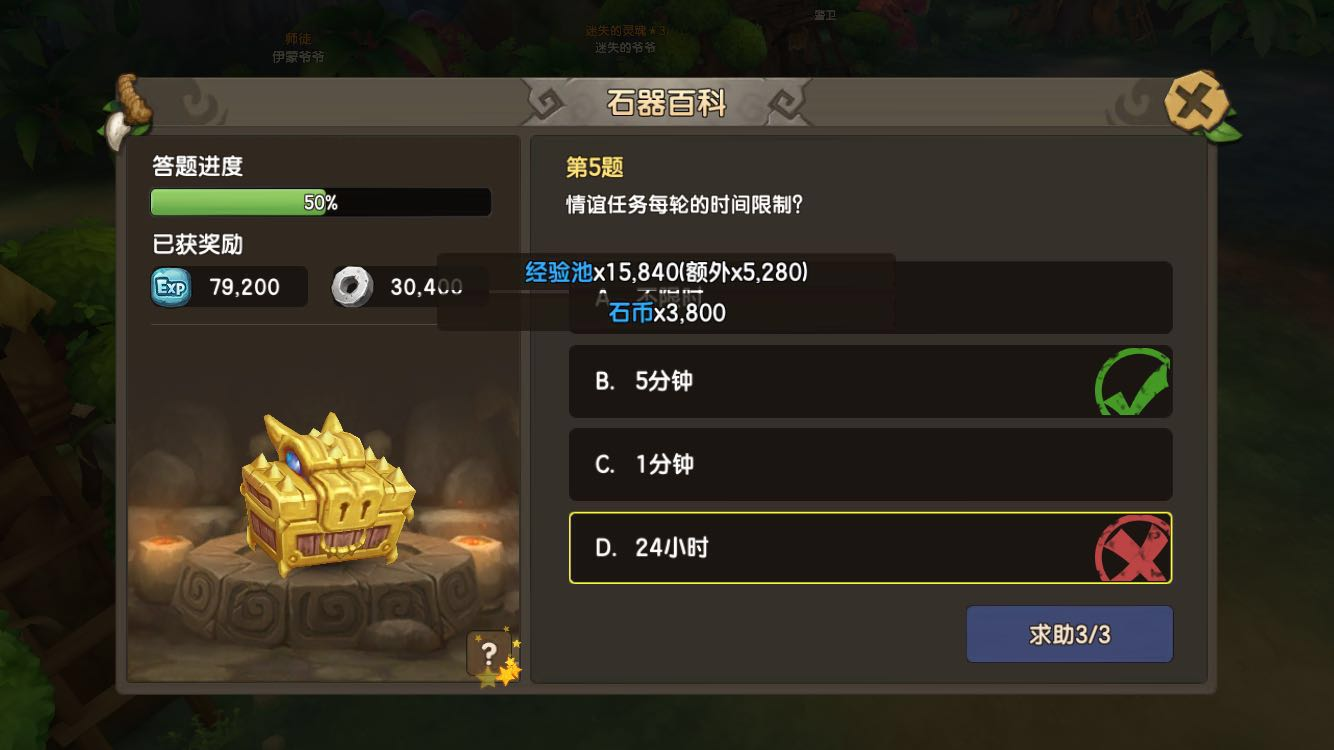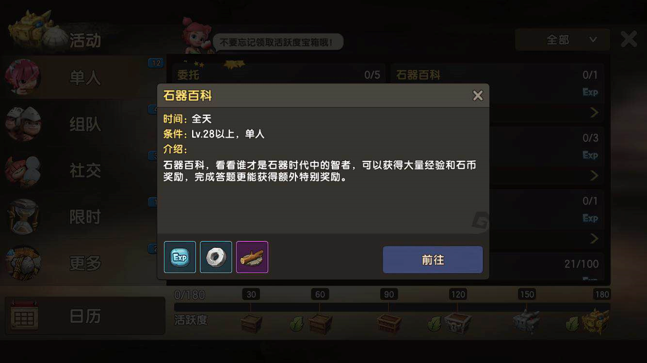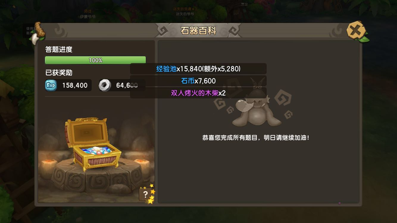 《石器时代M》的石器百科是考验玩家对石器世界观的了解。玩法简单休闲,就看看谁能全部答中,你对石器知多少,谁才是石器中的小机灵鬼? 1、玩法概述 石器百科是《石器时代M》中给予玩家了解、游戏系统玩法的一种途径,玩家可在活动时间内随时进入答题界面进行答题,同时还可互相帮助答题。玩家每次答题都可获得一定的奖励。 ? ? 开启时间:全天; 开启条件:玩家角色28级以上,单人模式; 次数限制:1天1次; 题目数量:每次10次百科答题。 2、答题流程 玩家可以点击右边的[活动]图标按钮,在[单人]中找到[石器百科]的活动,玩家将前往加加村的NPC塞尚对话,即可打开石器百科界面。 ? ? 石器百科问题类型主要是选择题,题库内容主要分成2大类,分别为系统和背景,一共10道。玩家将根据问题进行选择答案。每做一道题,界面左边将会更新相关的答题进度和已获奖励内容。答对的将获得经验和石币奖励,如果答错将会标出正确的答案。 ? ? 如果遇到不会的问题,每位玩家每天有3次求助机会,消耗1次求助机会将会打开聊天界面并将该题发送到家族频道中,由家族成员进行回答。 ? ? 玩家当天答题到一半遇到关闭界面或下线的情况下,若在当天再打开界面后还可以继续答题,若是第二天,答题内容和进度将刷新。 3、活动奖励 玩家每次回答[石器百科]的问题,可获得和自身等级相对应的经验和石币奖励,当角色等级达到50级以后,答错问题的只能获得50%的石币奖励。当玩家回答完所有题(10道)后,可领取额外宝箱的奖励,分别为2个双人烤火木柴。 ? ? 如果玩家全部答对时,可额外获得1个百科红包,百科红包只可在家族烤肉时发放。 |