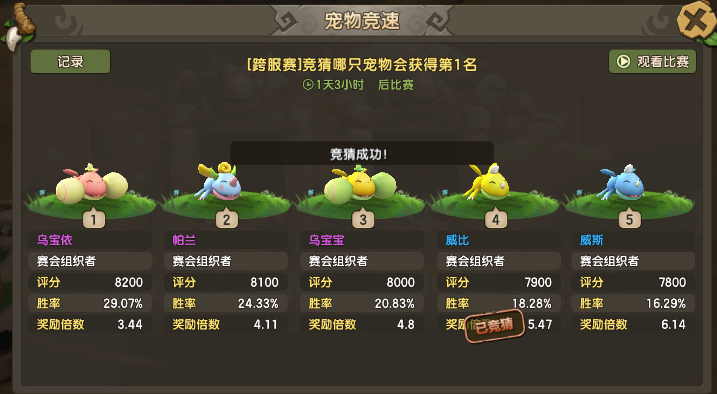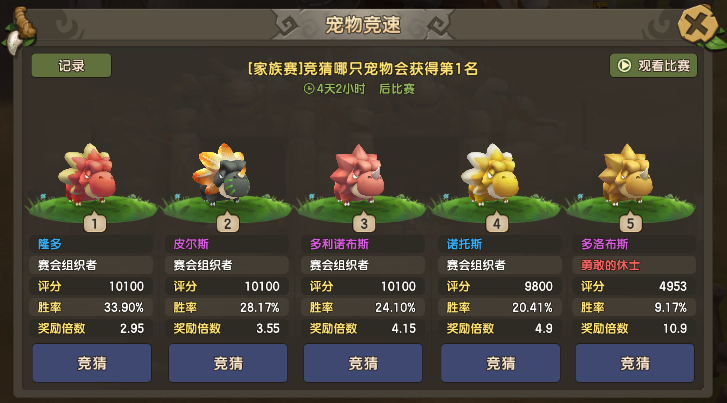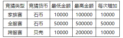 如果想要知道你在《石器时代M》中宠物的爆发能力是怎么样的,那么每周的家族活动之[宠物竞速]你一定要关注! 1、玩法概述 宠物竞速是《石器时代M》中宠物之间相互进行赛跑的活动,玩家在观看宠物赛跑的过程还可以对宠物进行自由竞猜,赢取丰富的奖励。 ? ? 开启条件:玩家角色等级达30级以上,且加入家族。 活动流程:每周为单位,周一0:00-24:00宠物预告,周二0:00-24:00报名参赛,周三19:00为家族赛,周五19:00位为全服赛,周日19:00为跨服赛。 2、竞速流程 宠物竞速的流程总共三个阶段,分别为家族赛-全服赛-跨服赛,具体得竞速流程和规则如下: 展示阶段: 周一0:00-24:00确定本周比赛的宠物系别和报名要求等,玩家无法进行报名参赛的操作。各服的参赛宠物系别均为一致。 ? ? 报名阶段 周二0:00-24:00宠物竞赛正式报名。具体报名条件如下: ? ? ①玩家在报名参加宠物竞赛,需要拥有该系别的宠物,且满足报名的等级要求; ②参赛宠物决定后将不能改变; ③如果能在家族赛中胜出,将一直参加全服赛、跨服赛; ④参赛宠物一报名时属性为主。 家族赛阶段: 周三00:00以一定概率在所有报名的宠物中挑选5只参赛宠物,玩家可以在00:00-19:00前对参赛宠物进行押注,19:00-19:30进入比赛时间,19:30为公布结果和发奖时间。 ? ? 家族赛选取规则:本家族所有符合条件的宠物(报名),按评分排名,概率选取5个为止,战力越高的越有机会被抽中;如果报名不满5人,比赛取消。 D.全服赛阶段: 周五00:00以一定概率在所有报名的宠物中挑选5只参赛宠物,玩家可以在00:00-19:00前对参赛宠物进行押注,19:00-19:30进入比赛时间,19:30为公布结果和发奖时间。 全服赛选取规则:本服所有符合条件的宠物(家族赛第1名),按评分排名,概率选取5个;如果家族赛第1名不满5人,在第1名全选取之后,按照选取规则补录家族赛第2名、第3名…… E.跨服赛阶段: 周日00:00以一定概率在所有报名的宠物中挑选5只参赛宠物,玩家可以在00:00-19:00前对参赛宠物进行押注,19:00-19:30进入比赛时间,19:30为公布结果和发奖时间。 ? ? 跨服赛选取规则:所有服务器所有符合条件的宠物(全服赛第1名),按评分排名,概率选取5个;如果跨服赛第1名不满5人,在第1名全选取之后,按照选取规则补录全服赛第2名、第3名…… 3、竞猜规则 在周三、周五、周日的00:00-19:00时间段,玩家打开[家族]→[活动]→[宠物竞速],可以对五名宠物进行竞猜,竞猜哪只宠物会获得比赛的第一名,不同类型的竞猜押注的类型各有不同。 每次竞猜只能对其中一只宠物进行押注。 ? ? 4、奖励产出 活动根据玩家进行押注的金额和奖励倍数进行发放。押注奖励=押注金额*奖励倍数。 ? ? 对于参赛成功的玩家,根据排名获得以下奖励: 以上奖励均由比赛结果出来以后邮件发送。 |