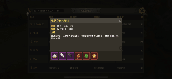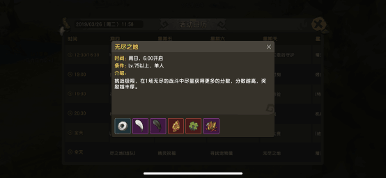 在无尽之战中,你能坚持多久?《石器时代M》手游无尽之战玩法说明 挑战极限,参加无尽之战的挑战中去,分数越高奖励越丰富,验证驯兽师们实力的最好体现! 无尽之地为限时活动,分为单人和组队两种模式,活动持续 1 天。每次持续时间均为早上6:00至次日6:00。 在一场战斗中无限刷怪,玩家击杀对应的怪物后,所占的位置立刻会刷出新的怪物,击杀怪物可获得分数,以玩家最终分数来给予奖励。 无尽之地有一个对应的排行榜(分单人榜和组队榜),榜上单人前500名和组队前100名均能获得排行奖励。 无尽之地单人模式开启条件: 周日,6:00开启 Lv.75以上,单人 可获得的奖励:石币、白色羽毛、黑色羽毛、翅膀进阶石、四叶幸运草、饰品礼盒(随机) 无尽之地组队模式开启条件: 周四,6:00开启 Lv.95以上,组队 可获得奖励:贝壳、白色羽毛、黑色羽毛、翅膀进阶石、四叶幸运草、高级饰品礼盒(随机) 排行规则: 1、 根据上周的结果,保留排行榜,直到下次开始时清空 2、 活动结束后,保留排行榜,直到下周开启组队无尽之地时,清空上周排行榜的数据,并显示组队无尽之地的排行榜 排行奖励: 1、 单人模式500均有奖励,奖励多少与名次有关 2、 组队模式100均有奖励,奖励多少与名次有关