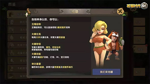 很多玩家都喜欢将《石器时代》称之为当年那个时代最经典的网络社交游戏,宠物、朋友、家族等等一直都是石器中非常重要的社交玩法。直到现在《石器时代M》中,延续了曾经的社交玩法并且新增加了小队玩法,而这些社交玩法中,玩家关系最亲密的莫过于情缘了。 原始的尼斯大陆上想要结识情缘并且结婚该怎么做?难道真的是拉走敲晕带回家?不不不,结婚讲究的两情相悦。在《石器时代M》中,你可以经历一次单单纯纯的趣味“恋爱”经历。从互相暗恋到表白送花,从情侣占卜到结婚任务,最后申请结婚,交换定情信物。至此你们才是尼斯大陆上令人羡慕的一对儿~ 看到暗恋、表白有没有让驯兽师想起曾经单纯的自己?在暗恋阶段,还不敢表明心意的你可以默默地将对方加到暗恋名单中,就像年轻的时候将对方放在自己的心里,每天只要看上那么一眼便觉得整个世界都亮了,心里充满的幸福感。 如果你是在忍受不了暗恋的痛苦,那么就向她送花表白吧,送花表白能够大量提升双方之间的好感度;如果你没有花,那就陪在她的身边,与她组队一起打怪冒险,日久生情,也是能够提升好感度的哦~ 当双方好感度达到1000之后,也就意味着你们已经在热恋期了。如果你们不满足于此,想要关系更进一步,真正成为对方生命的另一半,那就得接受来自见证了成千上万对婚姻的孟爷爷的考验,你们将一同完成8个结婚任务,以此来证明无论贫穷还是富裕、疾病或是健康,你们都会互相陪伴直到永远。 一旦你们通过了考验,那么就可以为自己举行盛大的婚礼了。婚礼有两种选择,普通婚礼与豪华婚礼,选择不同的婚礼类型会获得不同的奖励。当选择完婚礼之后,你们就已经确定了情缘关系,从此,她就是你游戏中的另一半了~ 光是一个婚礼当然不够,不然怎么向世人昭告你们已经结婚了?坐上石器时代最特色的恐龙,开始你们的婚礼巡礼,让其他的玩家羡慕嫉妒恨吧! 说是婚礼,喜宴当然是不能少的,喜宴与婚礼一样分为普通喜宴与豪华喜宴。但不管是哪种喜宴,都可以让这份喜悦分享给全服的玩家,大家可以来这里“蹭吃蹭喝”,当庆贺的烟花爆炸,满地都将是喜糖、贝壳,人品好的话还能得到狐狸系的魂石! 当你结完婚告别了单身,就可以互赠定情信物了,还能直接获得3星狐狸系宠物。将狐狸孵化,它将与信物一起作为你们婚姻的见证。 结婚除了告别单身还有什么好处呢?首先是夫妻的专属称号,【XXX的老公】【xxx的老婆】,将它顶在头上可以宣告这个人是有主的;除此之外还能获得夫妻的专属技能,当夫妻组队战斗时,一方受到攻击,另一方有几率冲过去保护,承担这一次伤害。而且称号与技能会随着夫妻恩爱值的提升而升级,我对你的爱不止在心里。 每周都会有夫妻任务等着两人共同完成,这是提升恩爱度的大好机会,并且完成夫妻任务会获得狐狸系的魂石与宠物蛋。不仅如此,每个月的结婚纪念日,都能获得系统为你们送出的礼包,周年纪念日更是有丰厚大礼。 结婚好处这么多,看完有没有心动呢?还不赶快去《石器时代M》里找到她结个婚?如果她不答应怎么办?没事,按照婚礼祭祀孟爷爷说的,握住她手,直接拖走,要是不走,拍晕了后强行拖走,原始人结婚就是这么耿直! |