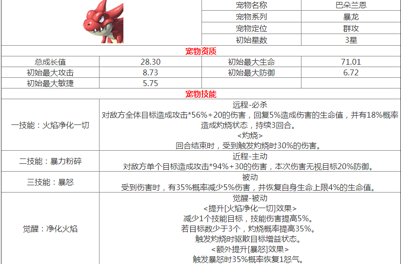 文丨lchigo 之前不少驯兽师有疑问,对于幼年暴龙,幼年九尾,小犀牛小乌龟等系是否进化? 是否升星后再进化资源上更妥当,我们一步一步分开说。 先说资源问题,如图所示: 4星小蓝暴进化大蓝暴 需要60大暴龙魂石 而3星幼年九尾进化大九尾需要20大九尾魂石 对于升星,相信大家有过经历都清楚了,3星升4星是需要40(目前宠物所属系别)魂石的。也就是单论资源节约来说,先升星幼年体再进化,和先进化再升成年体,所消耗的成年魂石数量是相同的,并且你还要额外的付出幼年体的20魂石(3星升4星需要40幼年体魂石)。以小兰蓝暴为例,先进化再升4星需要漆黑原石*15,水属性原石*30,大暴龙魂石*60;先升4星再进化则需要漆黑原石*15,水属性原石*30,大暴龙婚事*60,小暴龙魂石*20。 如果给你说晕了,那我们直接看结论,但从资源的角度来说,先进化再升星更划算,否则你要额外付出更多的幼年体魂石,也没法节约成年体魂石资源。 除此之外,我们从实用角度再来浅析一下,目前游戏进度内,哪些幼年体不要进化更实用,哪些幼年体进化后实力倍增。 我们用人气“车型”:暴龙系来做实例对比。 成长:成年暴龙在同星级的阶段,成长要优于幼年暴龙系。 技能:简单的看幼年暴龙和成年暴龙的技能对比。 【幼年暴龙系】 幼年暴龙在未觉醒之前,技能伤害百分比及技能数量都远不及成年暴龙系。 觉醒后10级觉醒技能满级最多增幅3个攻击目标,一下使得幼年暴龙一跃成为一线群攻宠(技能伤害百分比直接原有基础增加300%)。 而成年暴龙系,更倾向于作为战术宠,不同于幼年暴龙,成年暴龙的被动自保能力更好,被动技能站场能力强,1怒技能的单点突破能力优秀,4怒技能伤害略为分散,不能一下进行减员的打击,但拥有的宝贵的驱散增益BUF功能,觉醒后4怒技能对少量目标伤害量更加集中,弥补了点杀能力的短板。 暴龙系是否进化见仁见智,个人推荐水属性不进化幼年体更强,多3个攻击目标回血更多,火地属性可考虑进化,暴击和无视防御喷一口真正的灭世一喷。风属性可考虑进化之后做坐骑,状态命中+生存性能被动很难得。 阵容推荐: 运动款-幼年暴龙系+凯比系+薇薇系+布克系+幼年九尾系 加配款-幼年暴龙系+熊系+大九尾系/双头龙系+幼年九尾系+单点突破(猪系、人龙、鲨鱼系,风鲨很配熊) 【乌龟系,犀牛图不齐见谅】 另外讨论火热的巨龟和大犀牛(雷克斯)系,因为当前还未到120级,没有魂石商店,魂石的获取途径只有徽章商店,且徽章积分的资源兑换上他们与双头龙及熊系资源冲突,从资源角度来说建议暂停培养不建议进化,等后期资源富裕时候再考虑。 【小犀牛的加怒更加灵活】 这两系在资源分配上还有一个不同于其他系先进化,再升星的技巧,如果目前已经投入的较多资源在乌龟和犀牛系上,建议也不用停止培养,不要进化,使用小乌龟和小犀牛升星跟上进度,再后期再进行进化,乌龟和犀牛幼年体魂石来源稳定,在跟上大部队进度的基础上并不算浪费。 【觉醒技能收益上,巨龟后期更强势。】 【实用的全体援护,三技能简单高效的数值加成】 从实战角度看,小犀牛和小乌龟技能也很优秀。无论是乌龟的保护援护,还是犀牛的加速提怒都很实用。觉得进化后的大犀牛反而需要同属性才能提怒,虽说回血提怒加盾3重功效,但是对队伍属性限制更严苛并且需要4怒,队伍搭配上不如小犀牛灵活,而大乌龟的百分比伤害分担觉醒后还会分担治疗效果,在后期数值高(血多防高)时候比前期效果更明显。 阵容推荐: 犀牛(同属性) 凯比系-薇薇系-犀牛系-单点突破(猪系、鲨鱼、老虎系等)-幼年九尾 乌龟 成年暴龙系-乌龟系-薇薇系-凯比系-幼年九尾系 【幼年九尾系】 幼年九尾作为目前最炙手可热的国民级辅助角色其无论获取难易程度,实战表现,都当仁不让。强大的恢复能力,BUFF复制在同类治疗宠中并没有明显的上位替代品。而大九尾各有千秋,拿目前最为火爆的大九尾(地属性)来说,唯一一只魅惑DEBUF持续3回合的大九尾,比其他大九尾拥有更强的控场能力,不过控制系的重要属性敏捷,正所谓先出手控人,后出手被控,风大九尾在敏捷上的优势,以及对黑鸡(瑞西里尔)和地大九尾的属性压制,也使得他拥有一席之地。 说回正篇,大九尾系真正强势在觉醒后,并且携带二次攻击符文,通过平A直接造成魅惑效果,觉醒后的关键之处在于概率免驱散,否则地大九尾的3回合魅惑和2回合都是下轮被驱散,几乎没有区别了。 在幼年九尾的选择上,几乎是阵容是什么属性就用什么属性。大九尾则推荐地及风属性的进行进化。 阵容推荐:大九尾(地/风)+鸡系(黑鸡 红鸡 黄鸡等)+翼龙系或小犀牛或幼年九尾(同属性2怒养控制提前形成控制链)+群体伤害(小暴龙、布克系等)+乌力系 【翼龙系】 幼年翼龙的培养价值不大,治疗量和幼年九尾相近,但辅助作用不及幼年九尾,实在喜欢的话推荐水属性,可以在奶队友的同时增加护盾。 (翼龙系进化后无论奶量还是辅助能力都提升很多) 进化后的翼龙系才是翼龙的真正舞台,几乎是每系必备的强力辅助,奶量堪比幼年九尾,觉醒后同属性单回合回复2怒气碾压犀牛系,本体3怒技能奶人回怒高速辅助,是暴龙等4怒宠物的终极队友,是当前版本的毕业辅助之一,强烈建议进化。 阵容推荐:翼龙系(成年)+任意群攻/控制+任意群攻/驱散+单点突破(猪、人龙、老虎、鲨鱼、大舌头等)+辅助(双头龙 兔子系 卡克尔) |