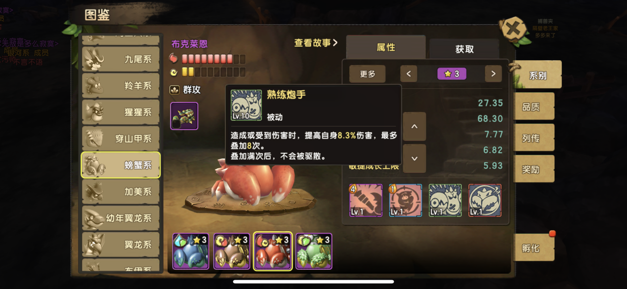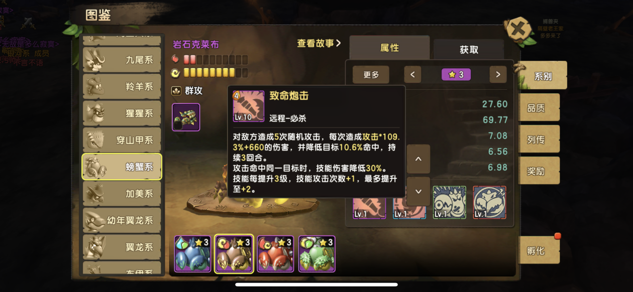 前话 螃蟹系,定位为游戏的群攻,我觉得是暴力输出,60版本前的超冷门宠物,熊猫级别,基本没什么人培养,主要在于版本的快节奏,螃蟹技能的节奏太慢,等螃蟹发力时候,又被驱散被动,战斗已经结束,只能是站着就被打死,所以这次更新也是想到这个问题,提高了螃蟹战斗的游戏节奏,让螃蟹尽快参与了战斗,被伤害或造成伤害都会叠加BUFF,叠加的BUFF不被驱散,觉醒技能的加强,这次也是算螃蟹的一个大加强了。这只大冷门宠物加强后是否能重上战场呢,让我们看看下面介绍吧 螃蟹系: 螃蟹系:被动技能调整——造成伤害或受到伤害时叠加,叠加层数-2,提升加成效果,加成总值不变 觉醒技能增强——[熟练炮手](被动技能)叠加满层后,每回合怒气回复+1 水螃蟹:克莱布 必杀技能和被动技能 伤害附加目标的百分比生命和减伤 风螃蟹:岩石克莱布 必杀技能和被动技能 降低目标命中和提高暴击 火螃蟹:布克莱恩 必杀技能和被动技能 造成灼伤+提高自身伤害 地螃蟹:森林克莱布 必杀技能和被动技能,降低目标命中+提高自身暴击 关于选择和新版本技能分析, 从这次的技能被动和觉醒技能的加强,明显的意图就是让螃蟹加快融入战斗,早版本的被动10层,叠满期间还能被威威系等宠物驱散,而现在从10层减到8层,虽然提高的%减少了,但是影响不大,大家都知道螃蟹叠加8层,就是一个大招的问题,7级以上大招就是5个目标+5层BUFF了,所以8层BUFF基本无意外在大招用了后就叠满,叠满被动后,还不能驱散(永久BUFF)觉醒还能每回合回1怒,我相信这么吸引的加强,螃蟹是绝对能够出战了,前提就是螃蟹非常需要保护,螃蟹游戏定义为了群攻,但是它的群攻可不是凯比的群攻,螃蟹的群攻输出是非常高的,只要搭配到正确的图腾和符文。对于螃蟹的选择,肯定是越暴力越好,我个人倾向于火螃蟹,因为还有烧伤的被动,还有高伤害。只要让螃蟹放出一发大招,敌人非伤即残。当然二选肯定是水螃蟹,能持续输出,不容易死。所以建议还是 水的螃蟹是最好的 定位优点缺点 螃蟹系定位为 群攻宠 优点:暴力,群攻,只要放出一二发大招,这盘战斗你已经赢了。 缺点:生存问题 太脆 培养: 性格选择暴击,其次是勇猛,因为螃蟹是输出,收益是当然是攻击暴击越高越好, 主要训练为二套方案, 一套,超级暴力全攻击60。 二套,求生存 半攻击半血 研究技能: 攻击 攻击% 防御 生命 生命% 命中 暴击概率 暴击效果 状态抗性 忽视暴击 图腾选择: 优先:暴击 暴伤 (金图腾 攻击 命中) 副选:攻击暴击 或者 暴击攻击 符文选择: 必备 攻击暴击 首选连击/副选 追击 改造:攻击 暴击 生命抗暴 首选强命/副选 清醒 改造:生命 忽视暴击 防御反击 首选复活/副选 厚皮 改造:攻击 忽视暴击 阵容推荐搭配:都是适合现在和120以后 第一套 推荐 水队 水螃蟹+水VV帕兰+穿山甲系+水翼龙+老虎 给出这套阵容,主要还是穿山甲的保护系统援护或者忠犬,去保护螃蟹,翼龙如果没资源就可以换成犀牛系,翼龙在觉醒后的加怒气是非常优秀的又有治疗,配合VV的减伤+水螃蟹的被动减伤 是很难杀死我们的螃蟹了,而且穿山甲还有反伤,老虎系可以自由发挥了,建议是白虎比较优秀,条件有限送的三星水虎也可以哦。这套阵容在放个水属性搭配水螃蟹的大招,是非常可观。不要觉得水螃蟹就没有伤害,水螃蟹利用目标%生命的伤害是非常厉害的。这套阵容请务必准备2-3个洁净符文。这很关键。 第二套 纯暴力火队 也是我比较喜欢的 当然资源非常难获取 火螃蟹+穿山甲+九尾+火羊+火熊 整体阵容非常暴力,问题也看出,非常脆弱,因为火系低敏和低血,这套阵容如果可以单配人物的光镜精灵使用是非常理由,九尾可以起到控制加补血,而羊在同系补血是相当可以可观,2-3回合到如果羊放出复活,那么基本就赢一半,火螃蟹的输出很高很高,带上暴击暴伤图腾,只要能够放出一个大招,敌人基本灭一半。 火熊目的也是输出+吸引仇恨值,火熊最好带上复活。 全体总结 为什么符文选择两段和追击,因为螃蟹的被动加成是造成伤害就有算永久叠加一层,而且螃蟹是最后出手就是收割的,所以两段就是两个叠加,追击到3个目标就等于3层,非常大的收益, 阵容只是参考, 螃蟹其实搭配方面大家想玩,建议可以代替阵容的天使凯比或者水小暴龙这种宠物群攻的宠物,水螃蟹的百分比伤害加成大招和高血量可以更好生存,是非常不错选择,新版本螃蟹是完全没问题上场,是可以培养了。随着冷门宠的陆续加强,游戏的玩法越来越多选择了。 |