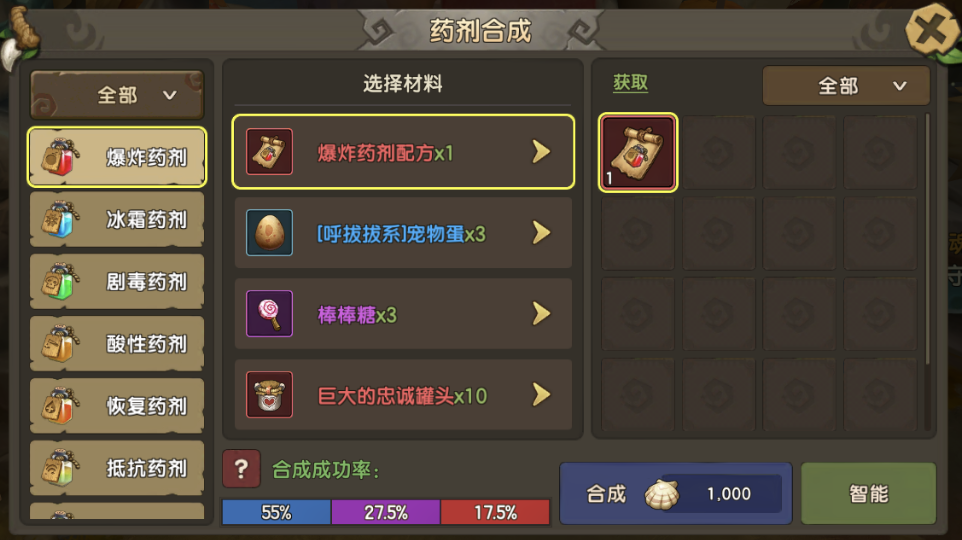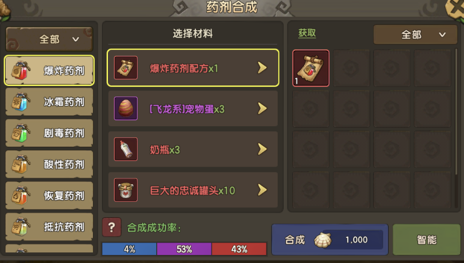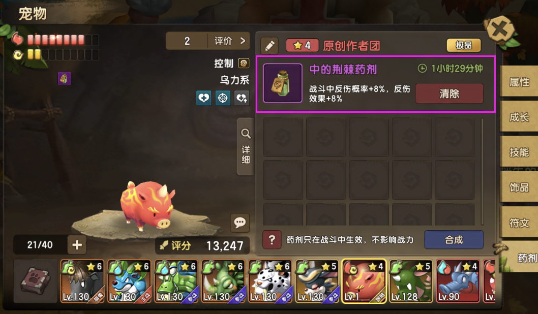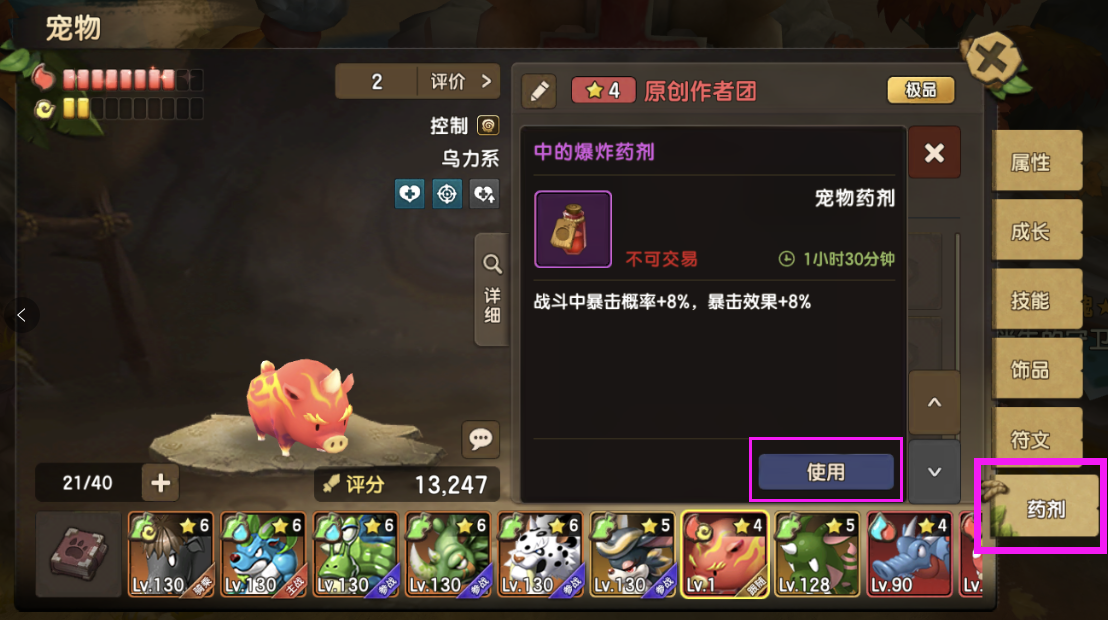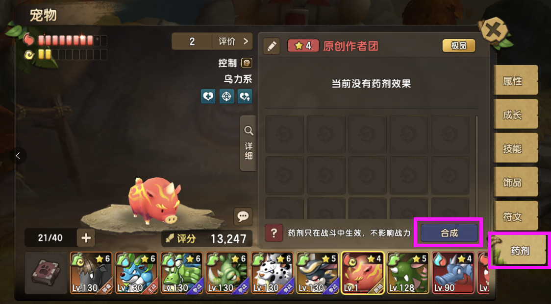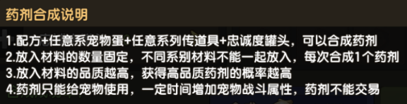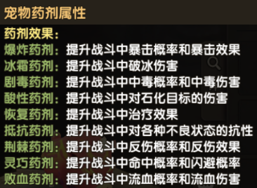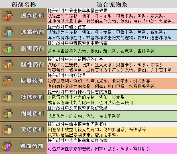 目录 新道具宠物药剂介绍 宠物药剂获取与使用 宠物药剂的使用建议 ◆◆◆◆◆◆◆◆◆◆◆◆◆◆◆◆◆◆◆◆◆◆◆◆◆◆◆◆◆◆◆◆◆◆◆◆◆◆◆◆◆ 一、新道具宠物药剂介绍 本次更新内容新增加了一个新玩法,宠物药剂。顾名思义就是给宠物使用的道具,该道具只在战斗中生效,不影响战力,是一次性的限时道具,可重复使用增加持续时间,并且同一宠物同时只能生效一个药剂效果。 药剂种类一览: 药剂主要分为三大类: 攻击类药剂 效果类药剂 生存类药剂: ◆◆◆◆◆◆◆◆◆◆◆◆◆◆◆◆◆◆◆◆◆◆◆◆◆◆◆◆◆◆◆◆◆◆◆◆◆◆◆◆◆ 二、宠物药剂获取与使用 药剂目前获取途径只能依靠合成。 进入宠物面板,在“符文”标签的下方多了一个“药剂”标签,点击进入页面,再点击合成就能引导你去萨姆吉尔村找npc进行合成。 宠物药剂可以用配方+宠物蛋+列传道具+忠诚罐头合成。 其中配方的获取只能在家族商店购买 家族商店不同等级可以购买的药剂配方不同,兑换均是360家族贡献,以下是对应的表格: 药剂合成有以下规则: 这里列出两个合成方案成功率图,这两个方案也是大家常用的。 第一种红色成功率最高的,达到43%成功率。 第二种方案,使用蓝色蛋,紫色列传,均是容易获得并且会溢出的道具合成,性价比高。 药剂使用很简单,只需要在对应宠物的药剂页面,选择药剂,并且点击使用就可以。 使用之后,这里就会显示药剂所剩的时间与具体的效果。药剂持续时间内,不影响宠物战力与面板,只在战斗中有效果,但是持续时间不在战斗中也会流逝。 而战斗中宠物的增减益面板内就会多一个药剂增益属性,并且持续整个战斗时间,不会被驱散。 ◆◆◆◆◆◆◆◆◆◆◆◆◆◆◆◆◆◆◆◆◆◆◆◆◆◆◆◆◆◆◆◆◆◆◆◆◆◆◆◆◆ 三、宠物药剂的使用建议 宠物药剂带来的收益非常强大,但是有一定成本,所以使用宠物药剂,一定要用在该用的地方。 例如:单人无尽,组队无尽,最强小队,家族狩猎,家族族战,庄园战,试练等关键战斗上。 以下是每种药剂适用宠物推荐: 宠物药剂需注意点 虽然宠物药剂能带来强大的实力提升,但在相对的宠物药剂有些地方却需要十分小心,否则将可能酿成最不想的后果: 同种类宠物药剂但不同品质之间(如同为爆炸药剂,但一个红色一个为紫色),是不能叠加时间,只能替换,并且重新计算时间(重置为1小时30分) 不同种类宠物药剂只能替换并重新计算时间。 所有宠物药剂有效时间都为1小时30分钟,该时间可以通过使用同类同品质的宠物药剂叠加 |