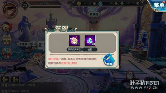2、 每日签到 阔爱的小鲸鱼,每天都会提供角色灵魂石哦~这时候花点小钱喂养,可以获得双倍角色灵魂石呢!