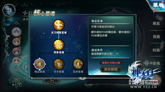 选择单人试炼激活星魂 新职业技能get 追逐更强试炼 每个职业都拥有自己的星魂成长树,激活核心星魂将会带来全新的职业技能。在第一次成功挑战试炼任务后,玩家们首先可以获得已解锁职业的第一重核心星魂,替换原有的见习星魂就可以习得全新的职业技能。职业技能和角色技能不同,它是属于本职业所有角色的通用技能,因此实战价值相当高。例如刺客星魂就可以额外增加15%暴击率,对于原本暴击就高的刺客来说,在星石上努努力几乎可以做到刀刀暴击。 目前《神无月》的核心星魂成长树分成三个阶段,当玩家等级达到第三阶的要求后,就可以根据职业发展规划来选择最先激活的星魂,当然前提依然是成功挑战该职业的中级试炼哦。想要获得更高端的职业技能,更强试炼在等待大家的挑战!