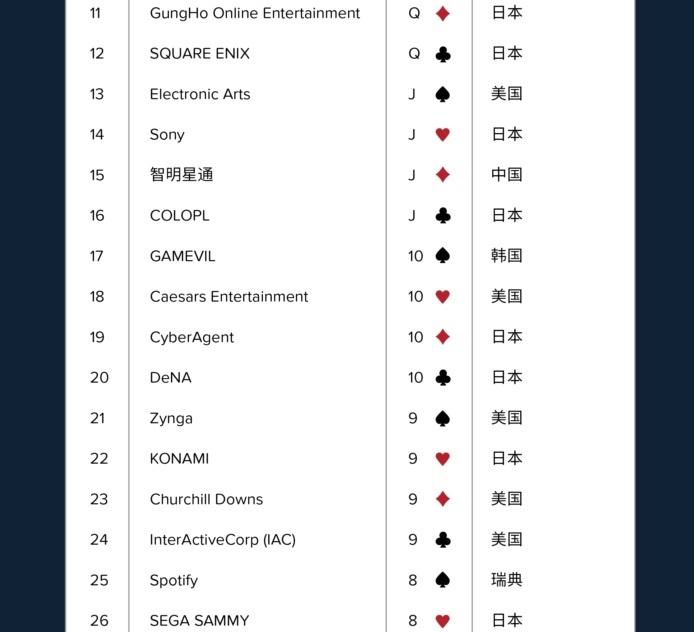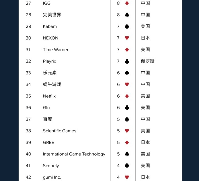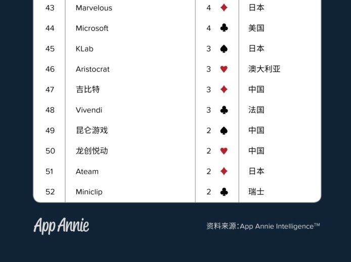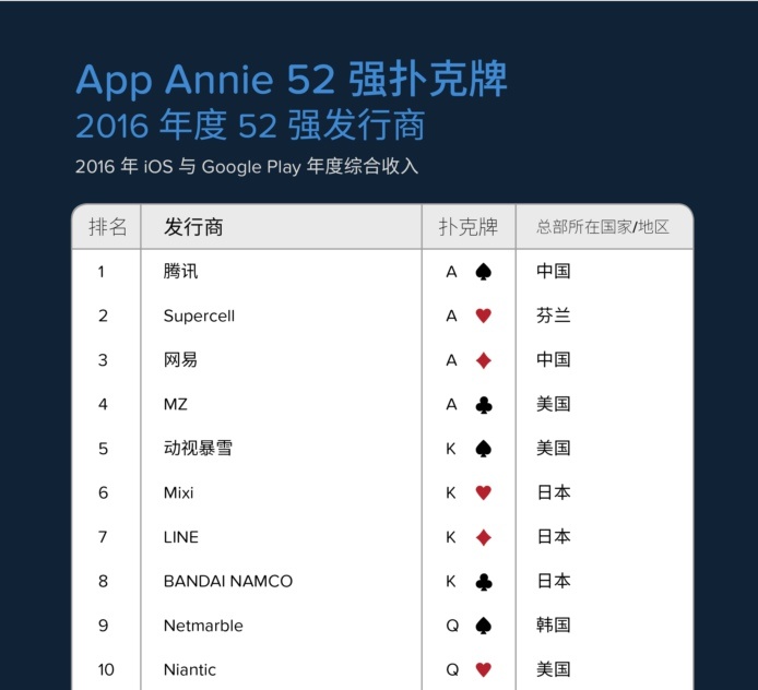 近日,知名数据机构App Annie公布了2016年全球手游发行商52强排行榜。按照惯例,App Annie会根据一副扑克牌52个的不同花色不同点数为各个发行商分门别类,荣膺52强是一项特殊的荣誉,专门用于表彰 iOS 和 Google Play 商店收入排行榜上的顶尖发行商。 相较于2015年,2016年的榜单变动较大,中国厂商在本次榜单上得到了明显更高的“存在感”。国内两大巨头网易和腾讯纷纷跻身全球前三,老牌全球手游“吸金王”Supercell这一回只能屈居第二名。其中与 2015 年相比,腾讯的排名从第 6 跃居第 1,网易的排名从第 9 升至第 3。 共有11家来自中国的发行商入围全球前52强,不过,占据最大头的依然是美国和日本的发行商,他们分别有17和16家公司入围。 在这一次,App Annie 也首度公布了中国出海全球十大公司榜单。此榜单按照除中国大陆地区之外的 iOS 应用商店以及 Google Play 综合收入,对来自中国大陆的移动应用发行商进行了排名。此次上榜的 10 家公司也不出意外由游戏发行商所包揽。 以下为本次榜单的完整排名: |