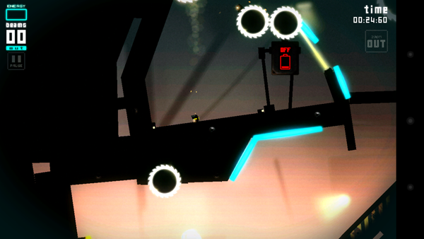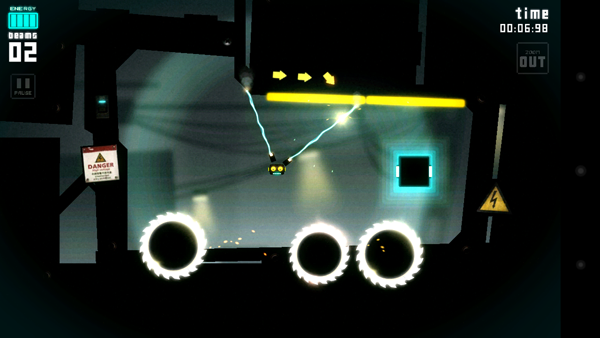 前面提到了游戏玩法与《割绳子》十分相似,确实如此。电池就是《割绳子》中的糖果,出口就是《割绳子》中的小怪物Om Nom。不过,接通电流的位置不同,影响着电池的悬吊位置,以及有限的接通电流次数,都直接决定能否顺利通关。连接电流时,微小的距离都可能导致电池碰到那不断来回旋转的发光的齿轮,直接GAME OVER,所以每一次使用电流要经过深思熟虑。当然还有一些小机关,需要电池为其充满电才能够启动机关,从而更好的通关。