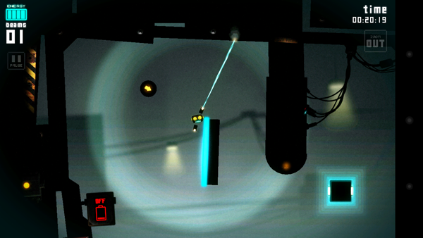 游戏界面简洁,左上角蓝色的电池符号,也就是生命了,点击电池,就可以通过消耗一点生命了来获得向上弹起的动能,共四点。电池耗尽生命将自爆。电池下方有一个beams和数字,这个是你能连接多少的电流条数,每个关卡的电流条数不同。在time下面还有一个IN或OUT,IN扩大画面,OUT缩小画面。但有一个特别非常大的缺陷,一些范围大的关卡缩小画面后,看不到全景。这令小编抓狂了N次,好不容易通过了前面的障碍,终于看到了出口,却发现没有电流连接数了,只能看着出口各种“自杀”,然后重新游戏。另外要特别注意的是,在电池外网有一个光圈,这个代表电池电流能够连接电流的范围。