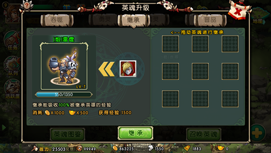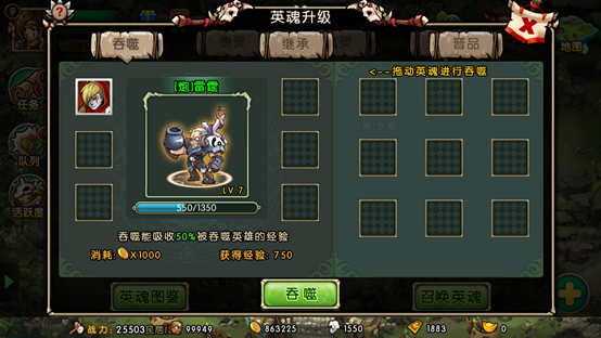 其中吞噬只能获得50%的英魂经验,而继承则能获得100%的经验,不过继承需要消耗不少元宝,